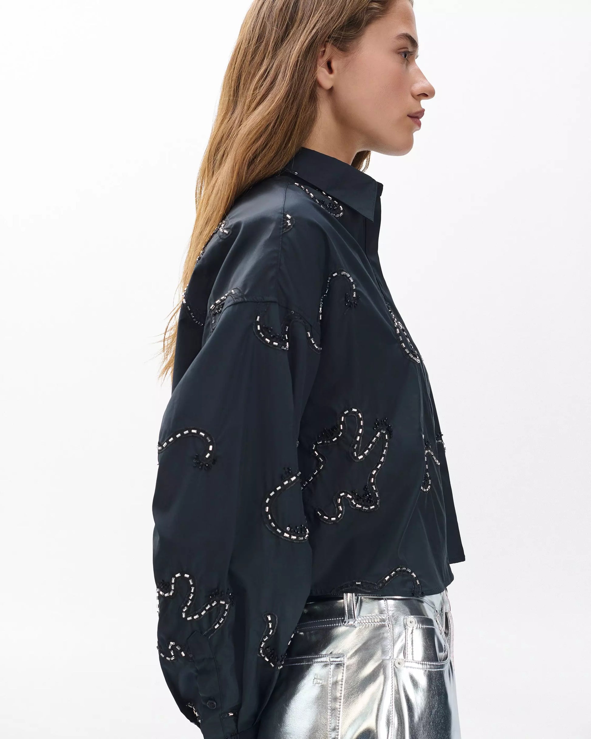 This cropped, relaxed shirt silhouette cut from an effortless cotton poplin. It meets classic button-down elements with beaded embroidery details to create a unique style that can be dressed up with trousers or dressed down with denim