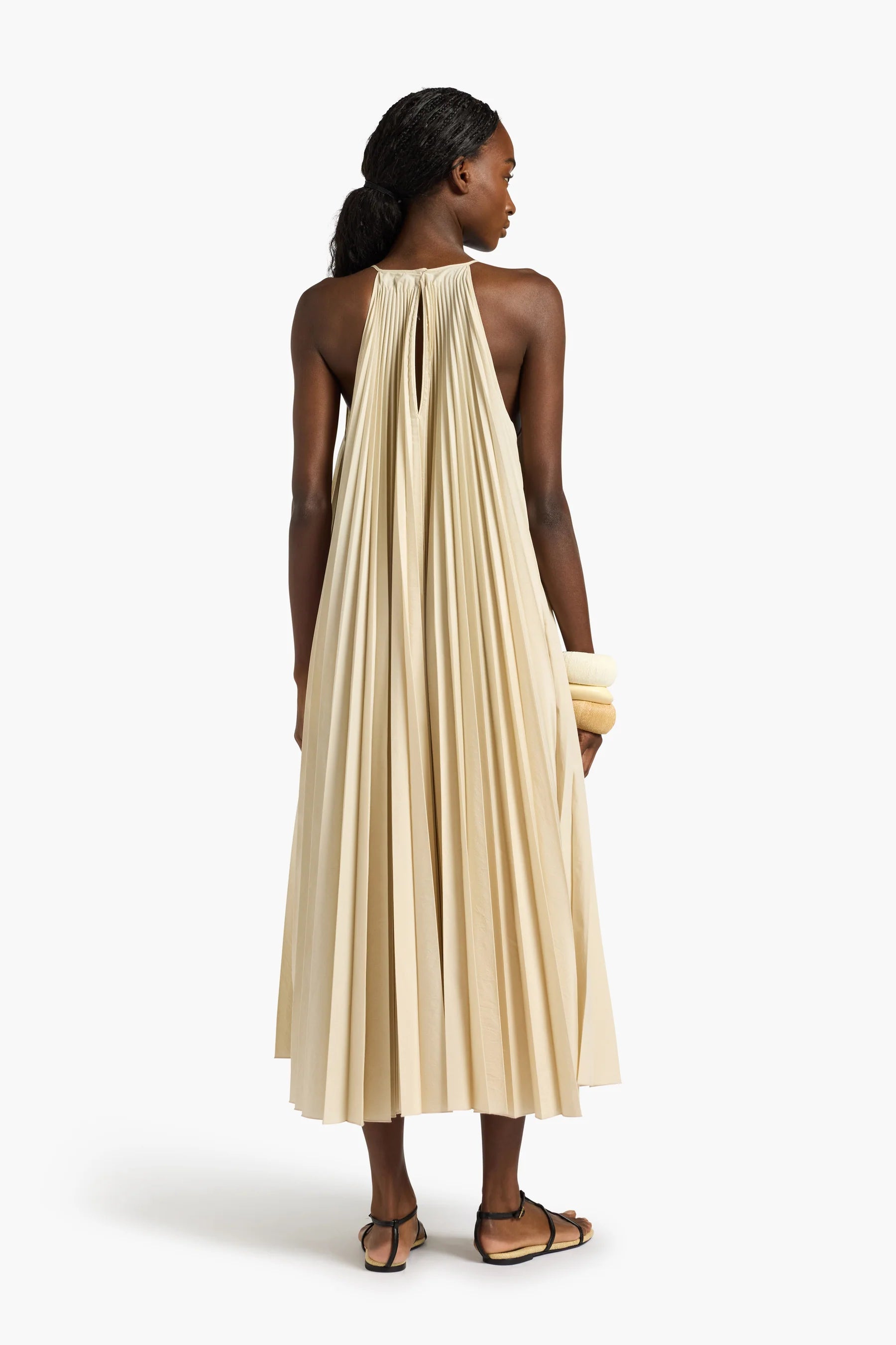 SLEEVELESS PLISSE DRESS IN COTTON ORGANZA. ROUND NECKLINE WITH THIN STRAPS, DROP CLOSURE WITH BUTTON AT THE BACK. SLIGHTLY A-LINE, ANKLE-LENGTH.