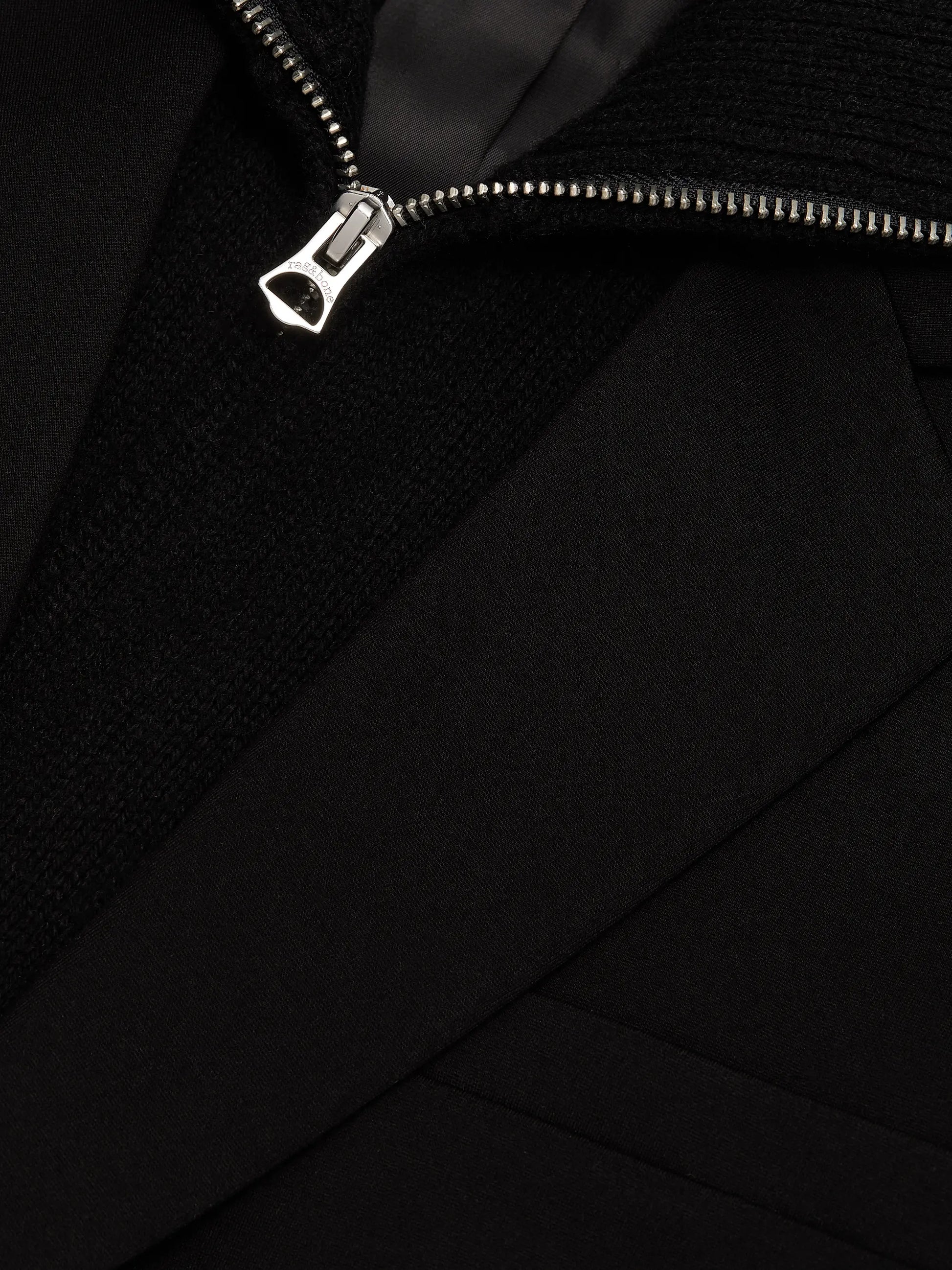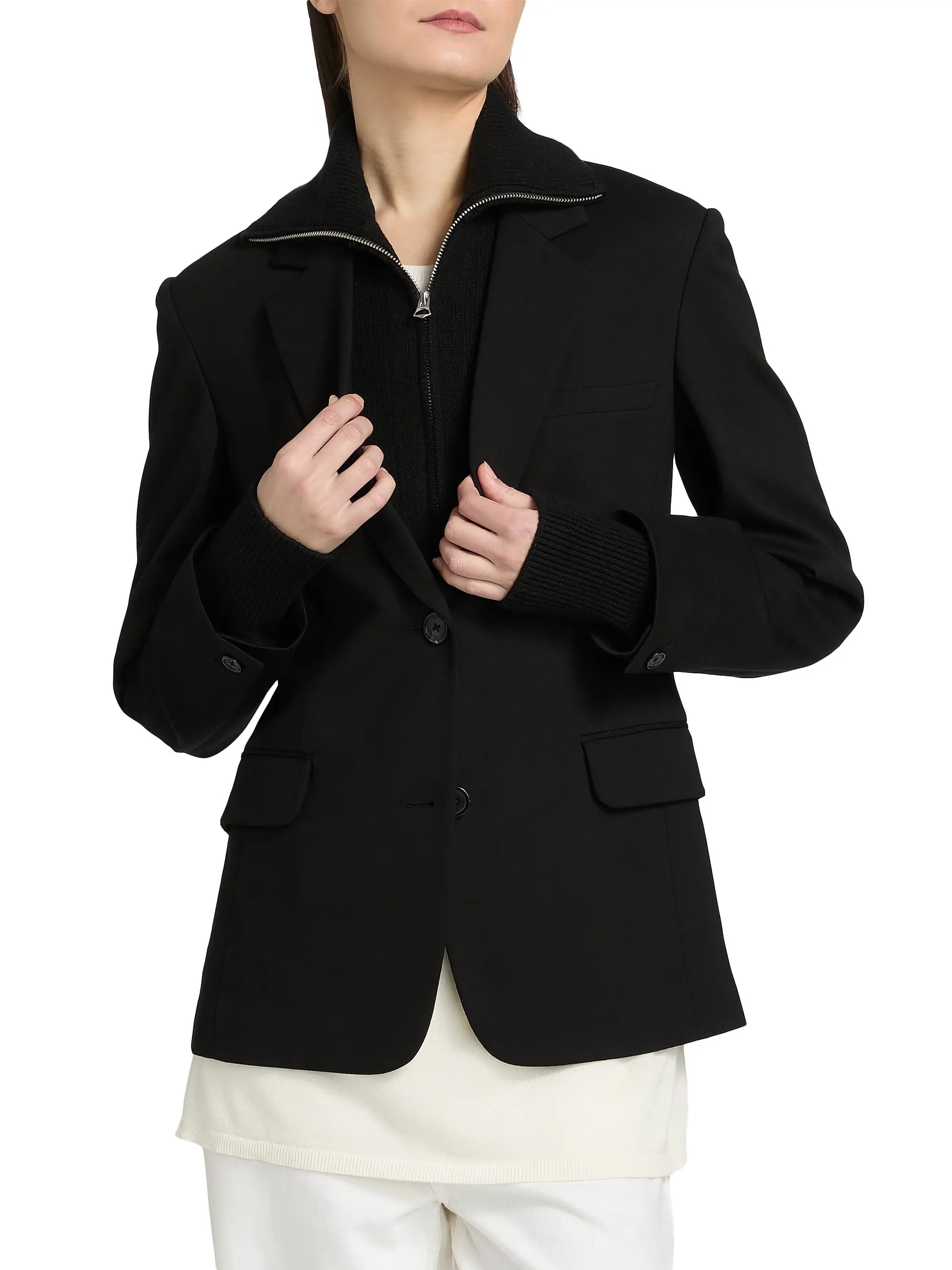 • Detachable full-zip collared sweater insert with invisible zipper and inside buttons at back neck