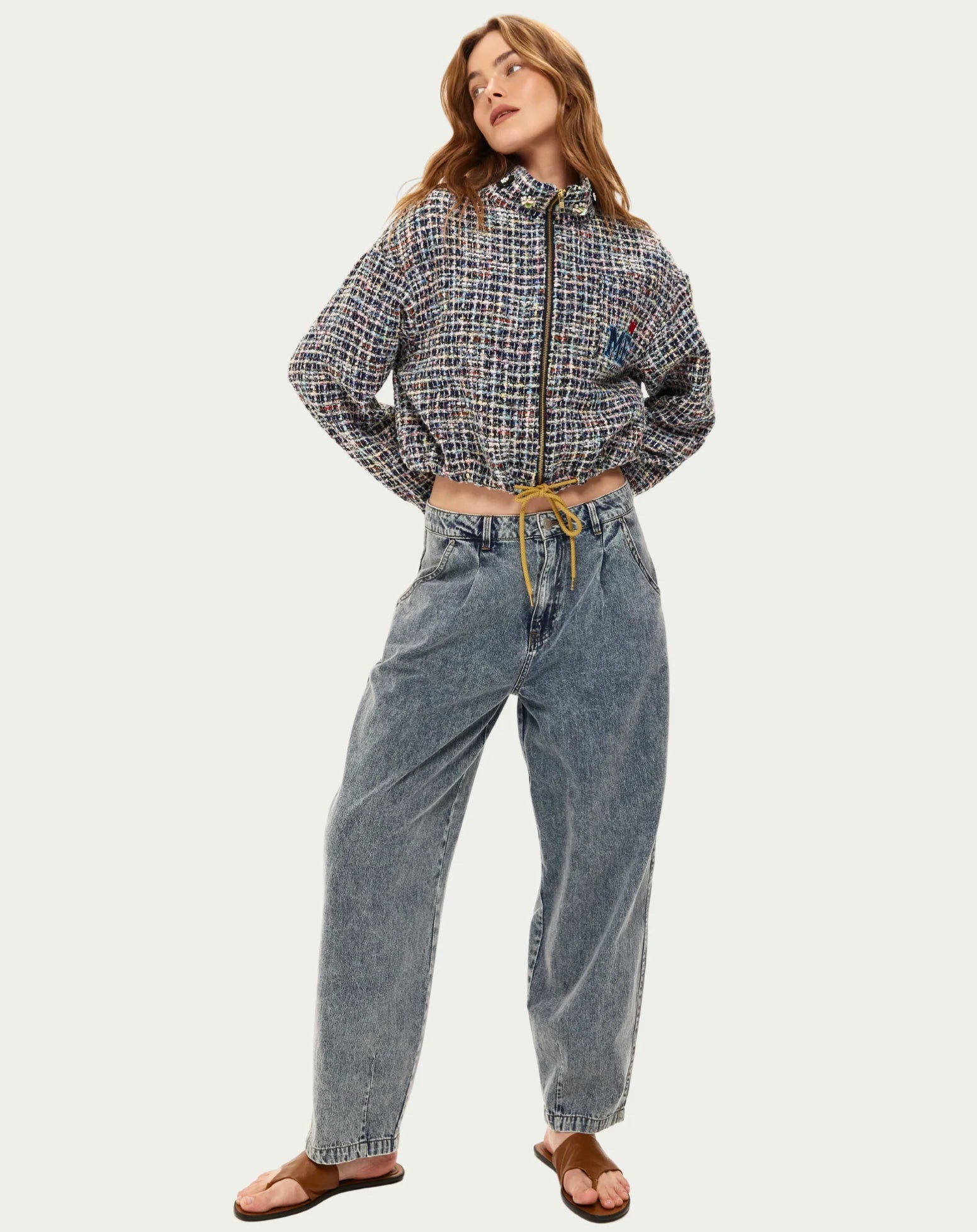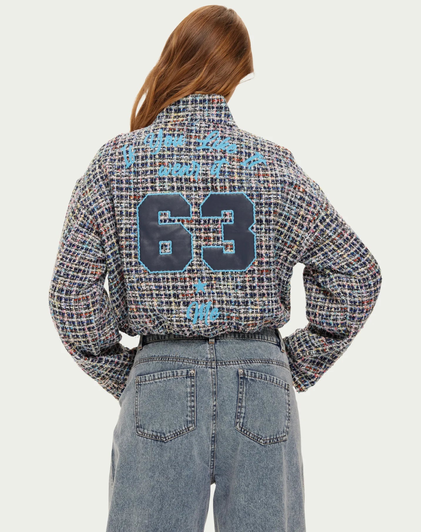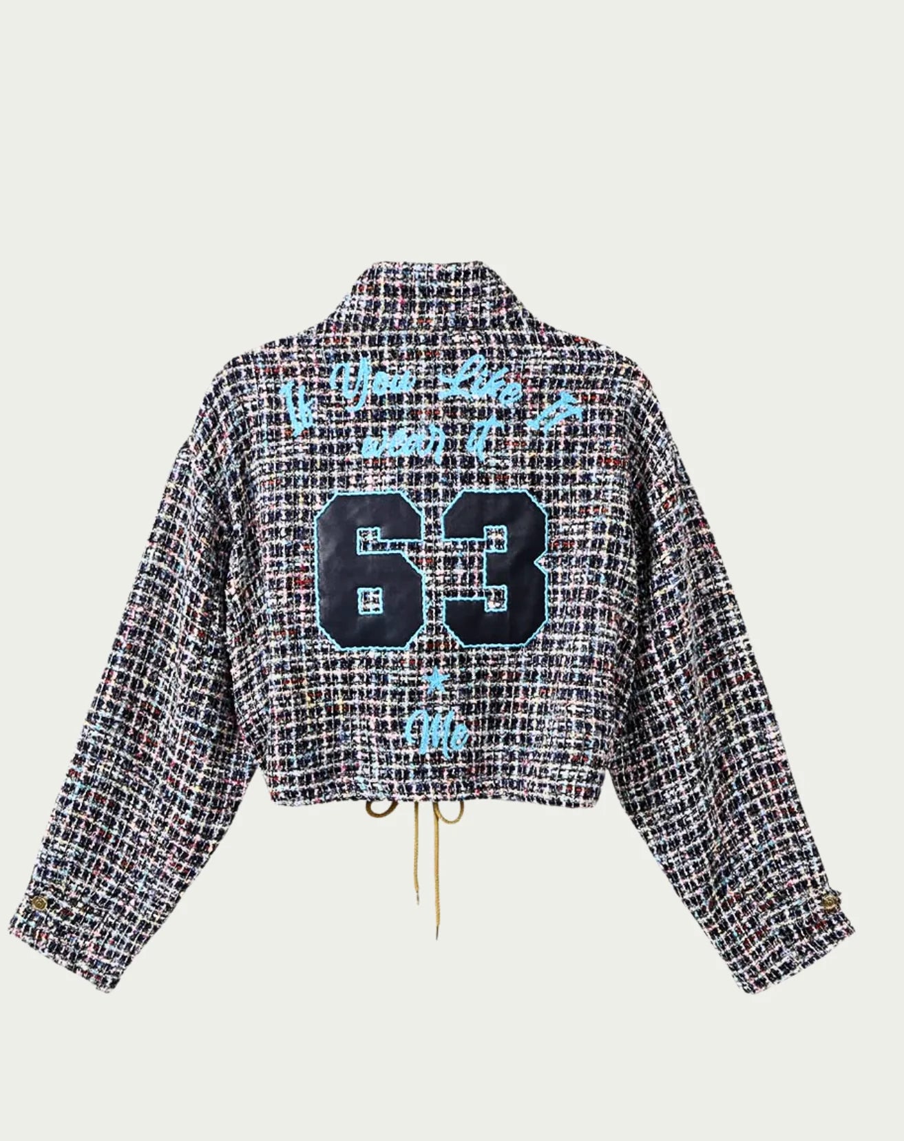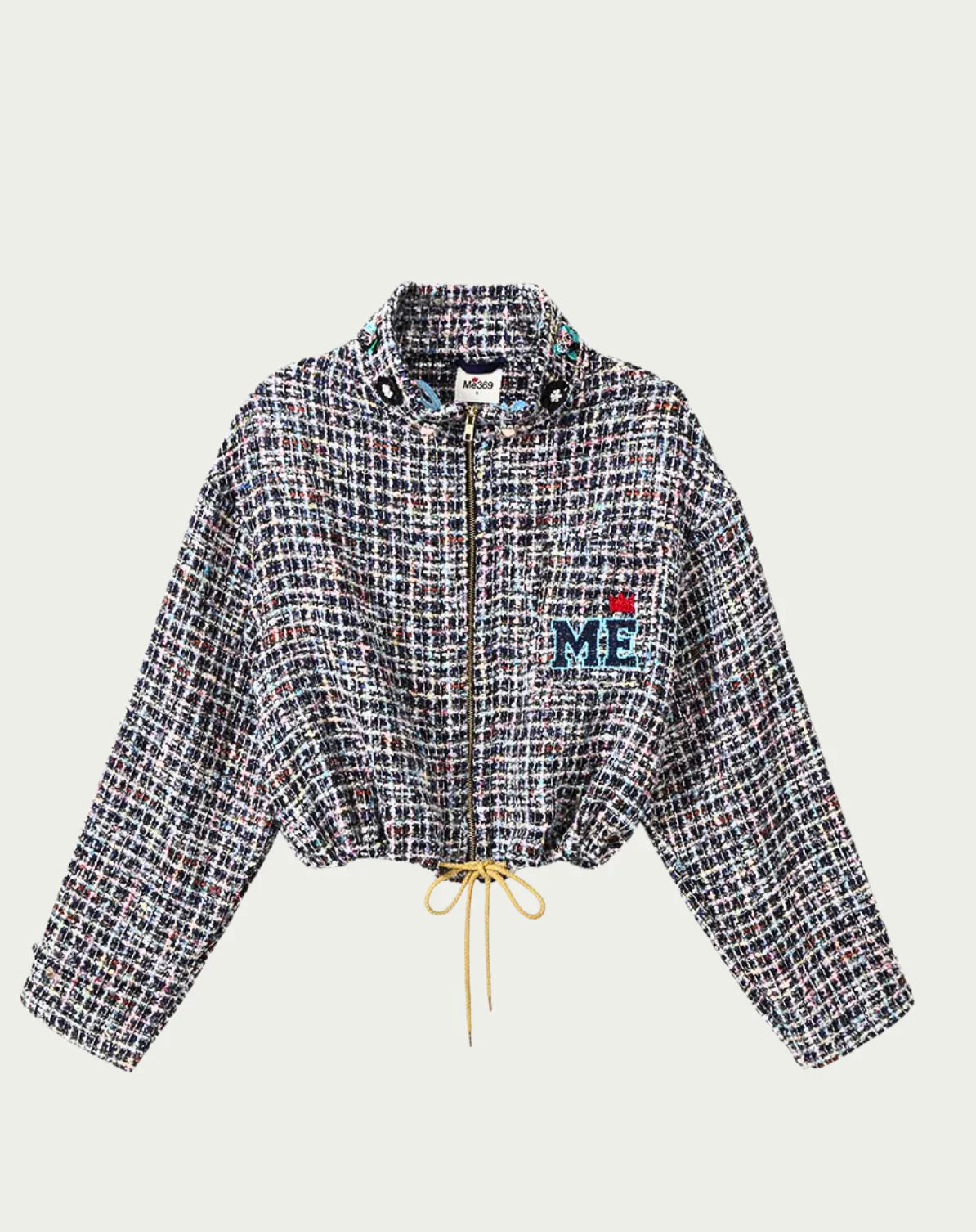 Fresh and feminine. The Ivy jacket in green tweed features the signature varsity details: "63" and "Me" embroidery on the back. The cropped silhouette and zip-front closure with yellow drawstring ties bring sporty style to luxe tweed