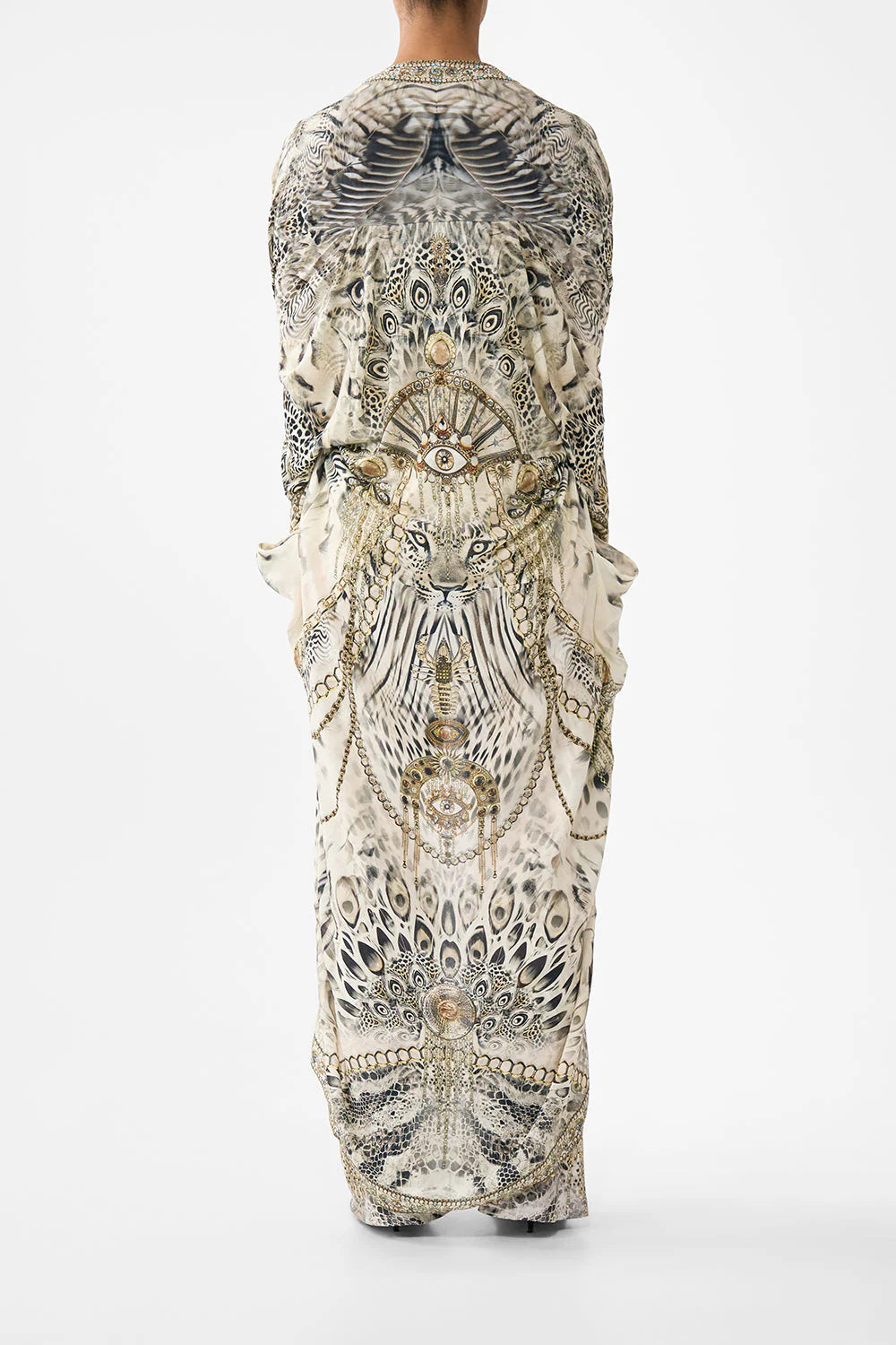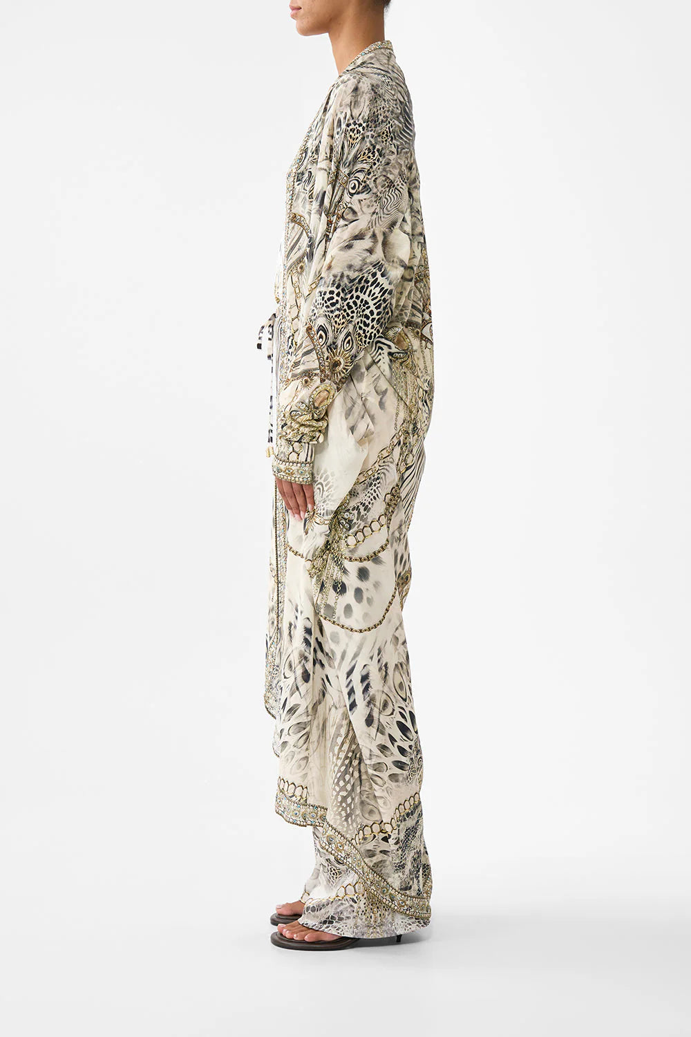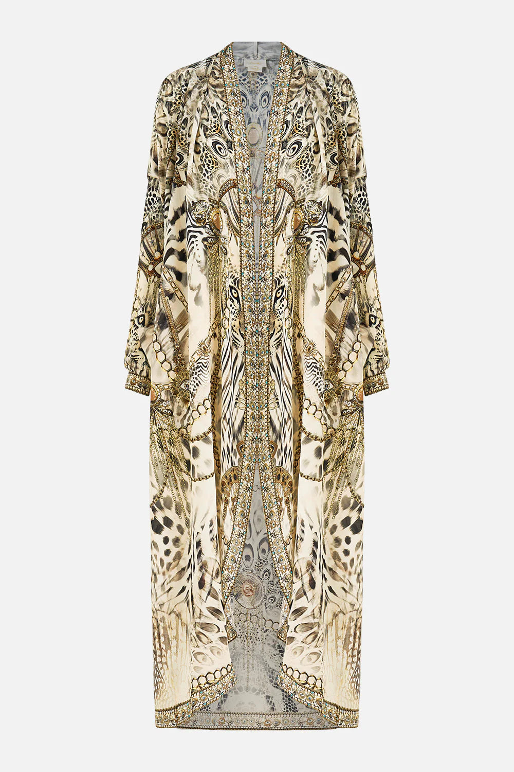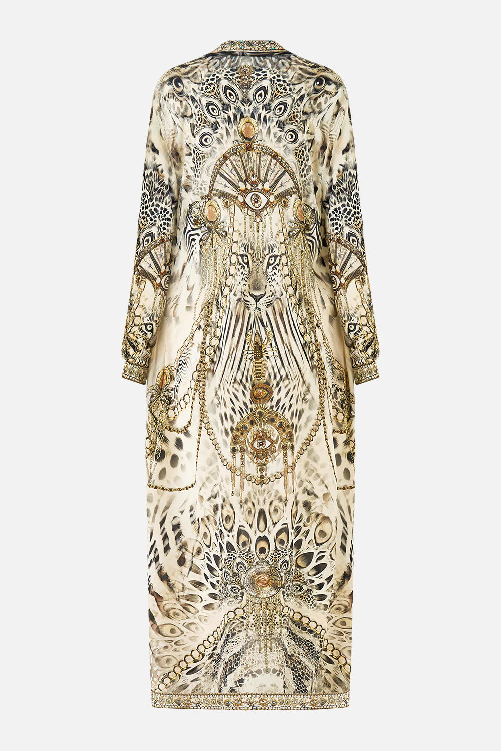 Handcrafted silhouette designed by our in house artisans. This casual jacket is cut with long sleeves and falls to an elongated, full length hemline. It features functional pockets and textured details for luxurious comfort and is finished with intricately placed crystal embellishments.
