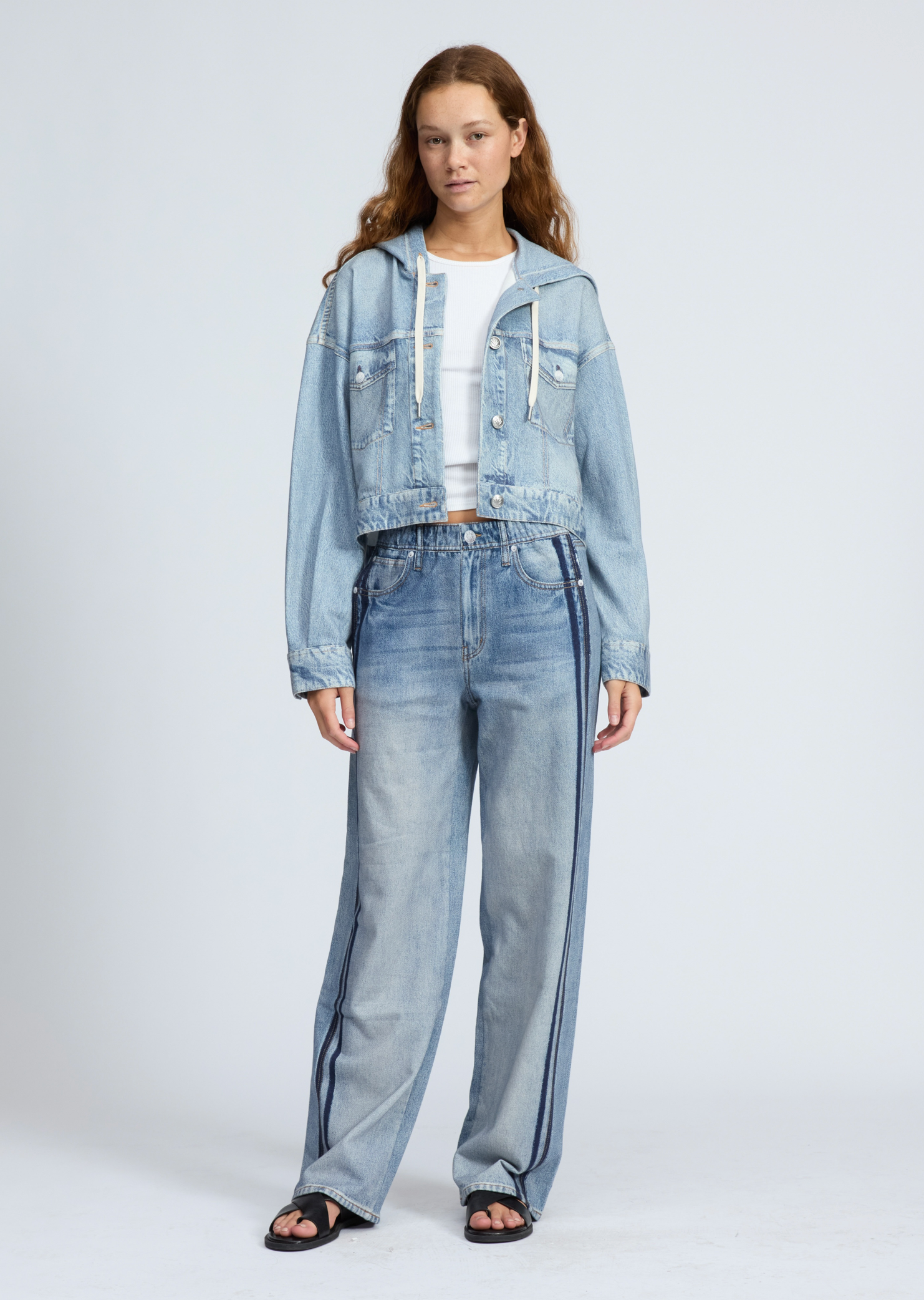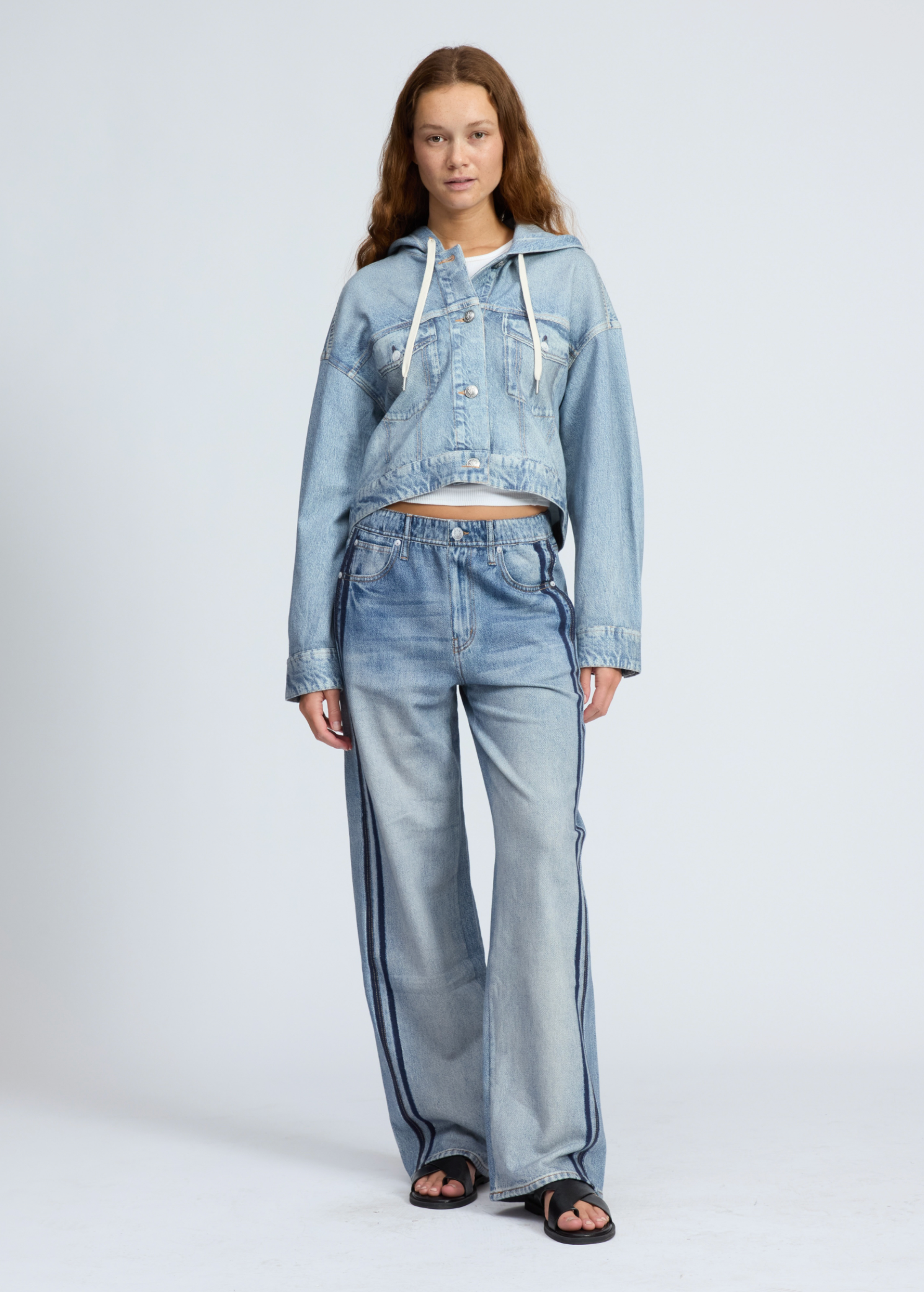 This hooded trucker jacket is cut and sewn from cotton terry cloth that's ultra-soft on the inside and printed on the outside to look like a denim vest layered over a hoodie