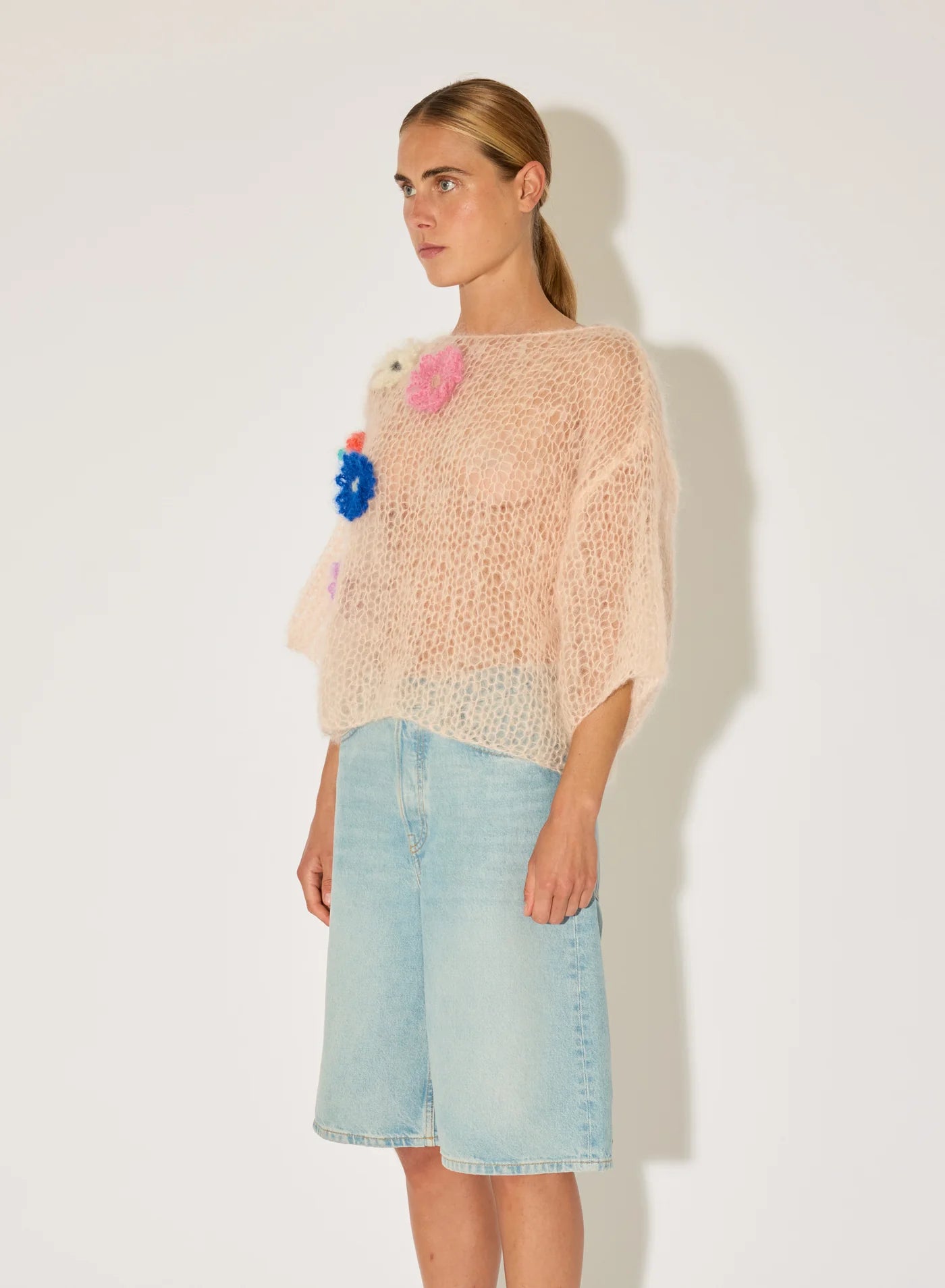 The relaxed shape has become one of Maiami’s modern classics over the past seasons. Hand-applied floral motifs add a playful, tactile detail, bringing colour and character to the delicate knit surface.