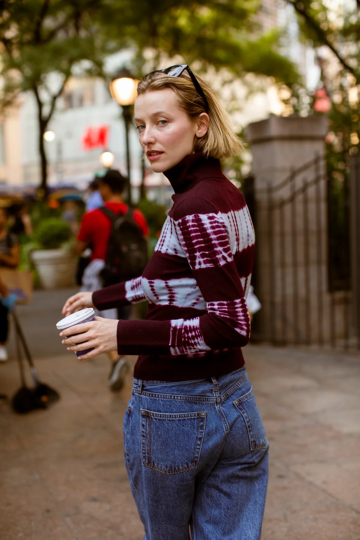 • Fitted long sleeve turtleneck with hand tie-dyed novelty knit