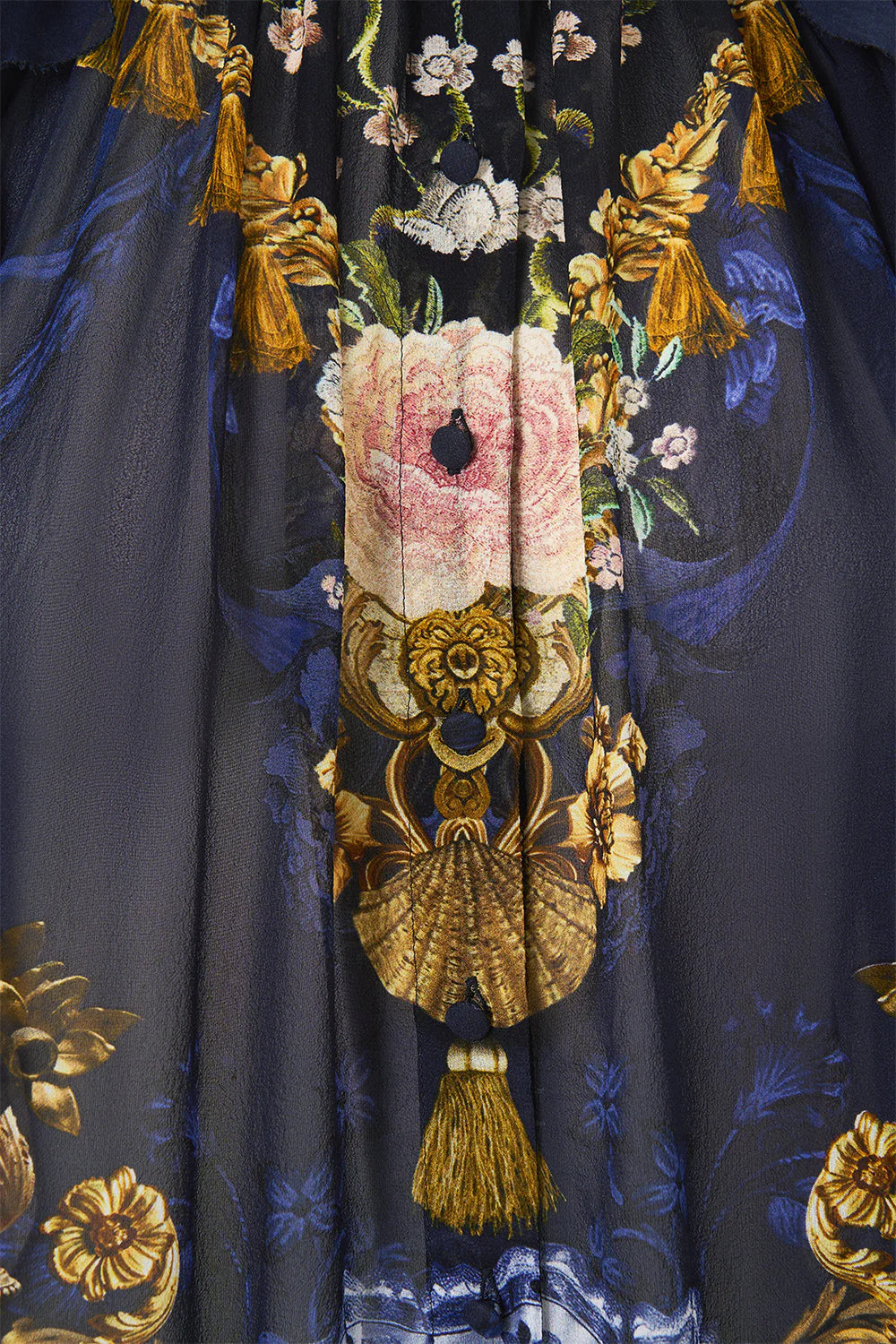 Silk high neck blouse sees feminine frills reimagine the blouson sleeve. Featuring button front closure, intricately applied crystals adorn the fabric as elasticated cuffs offer adjustability in the sleeve length