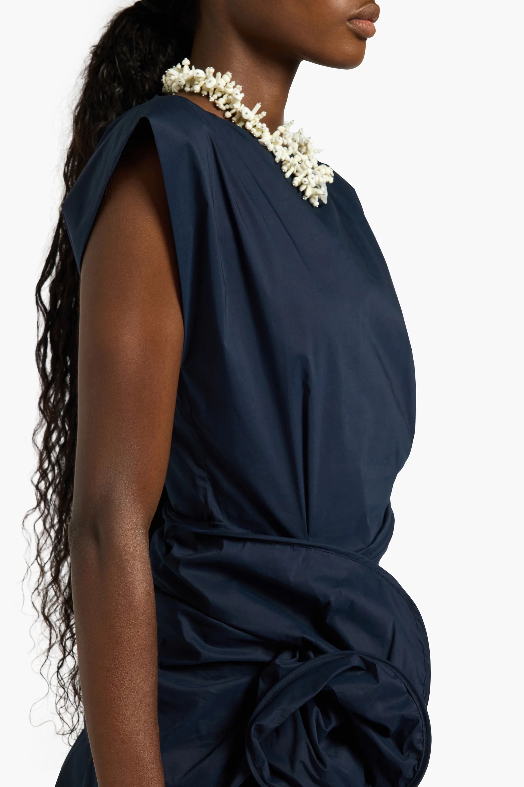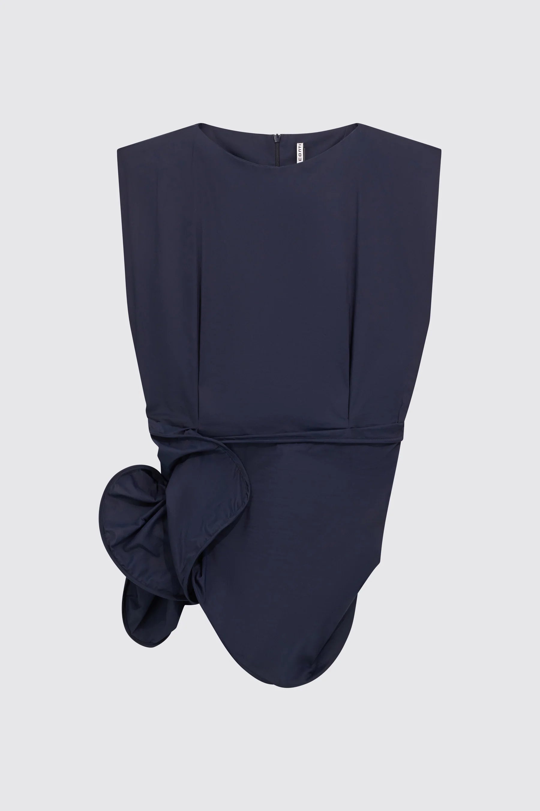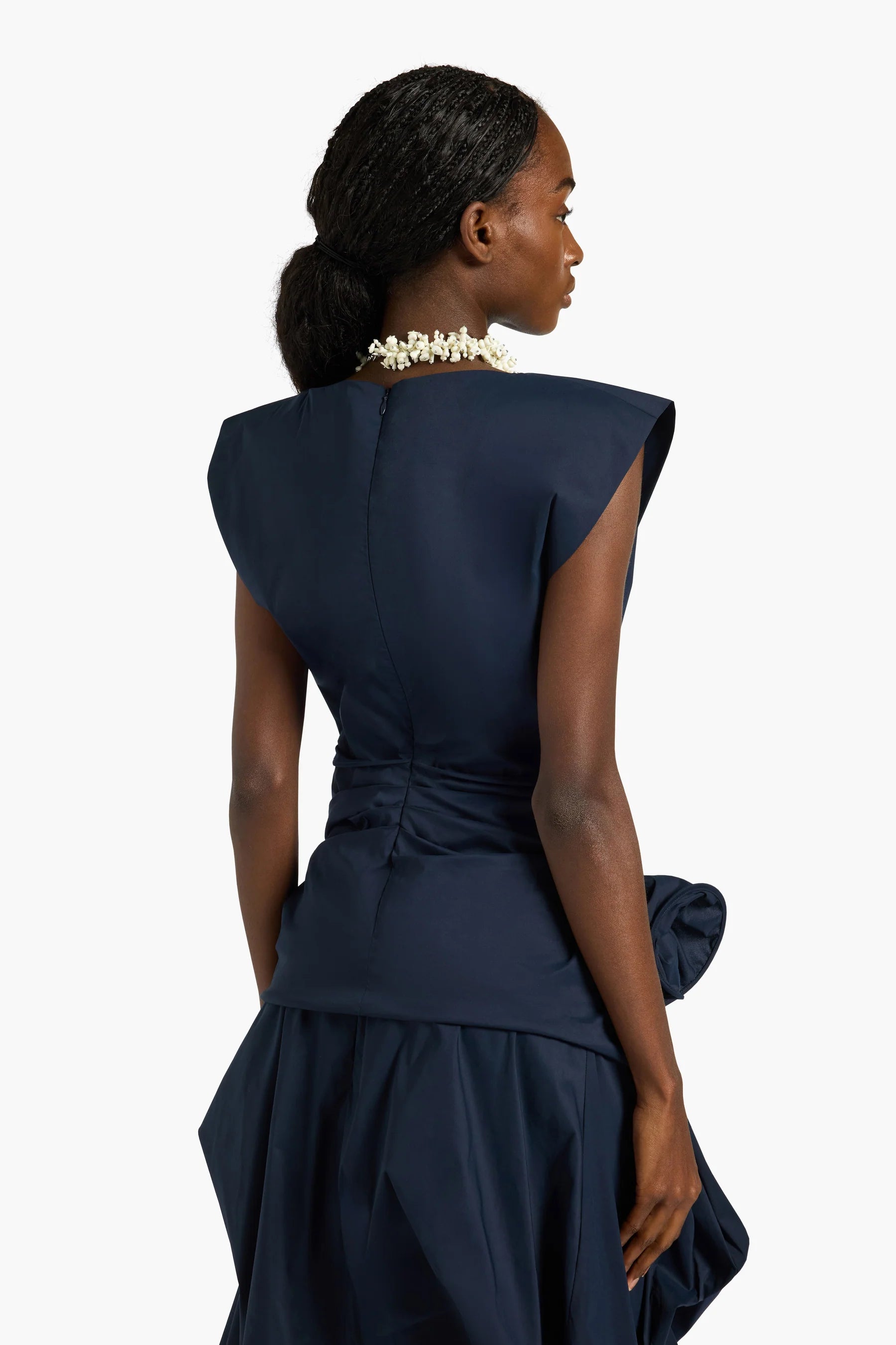TOP WITH ROUCHE IN STRETCH POPLIN. BOAT NECKLINE WITH SLIGHT WING SLEEVES, BAND WITH APPLICATION. FITTED LINE, HIPS LENGTH.